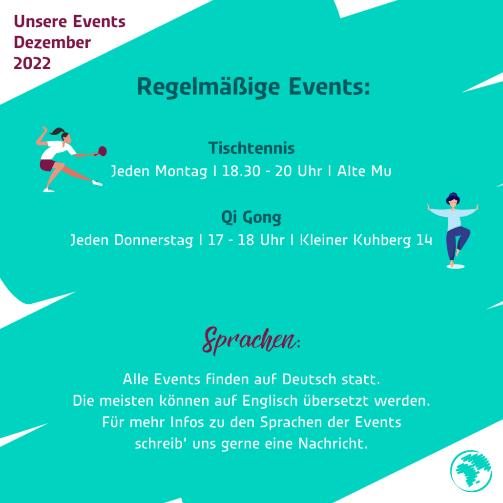 Im Dezember laden wir euch zu einem Philosophischen Café ein und veranstalten ein Koch-Event mit Speisen rund um die Welt 🥗. Es gibt natürlich auch wieder unsere internationalen Sprach- und Frauencafés 💬🗯 . Auch am Tischtennis und Qi Gong kannst du teilnehmen🏓.